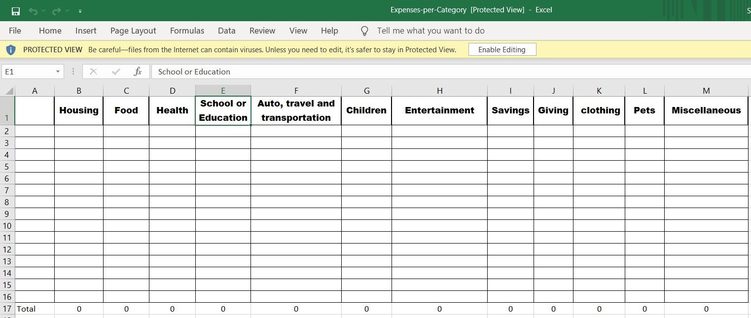 No need to invest in paid expense tracking software; this monthly expense tracker can help you track expenses in nine different categories. All the columns are editable, so you can change the list as per your needs.