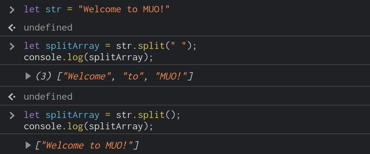 If you don’t pass an argument to the split() method, it’ll return an array with a single element consisting of your string variable’s value.