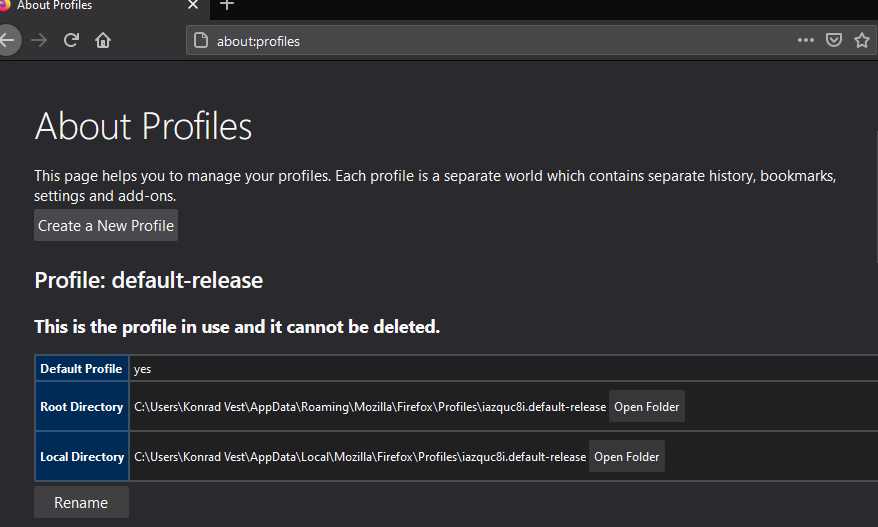 Once you have unzipped the downloaded profile, you need to make a default profile for your Firefox browser. Do so by typing “about:profiles” in your address bar, and hit Create a New Profile.