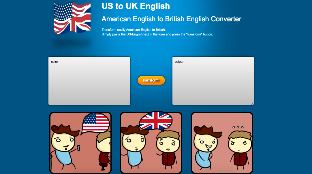 Scroll to the bottom of the page to choose either UK to US English, or US to UK English. Type your words into the left-hand box. Click on the transform! button, and your translation appear in the box on the right.
