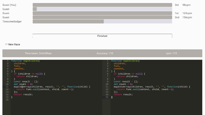 Mistakes aren’t allowed in Coderacer, and that’s where it can get difficult. Each space and character need to be perfect; it will highlight mistakes that you have to fix before submitting. You can share a link with friends too, challenging them to a speed-coding round. Once you submit, you’ll find the time taken, characters per minute, and error count, with a comparison to others.