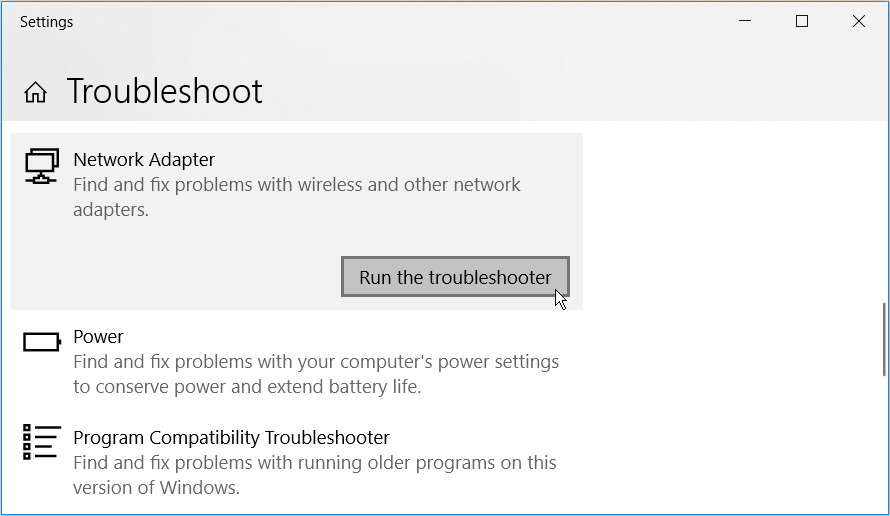 - Select the Network Adapter troubleshooter and press the Run the troubleshooter button.