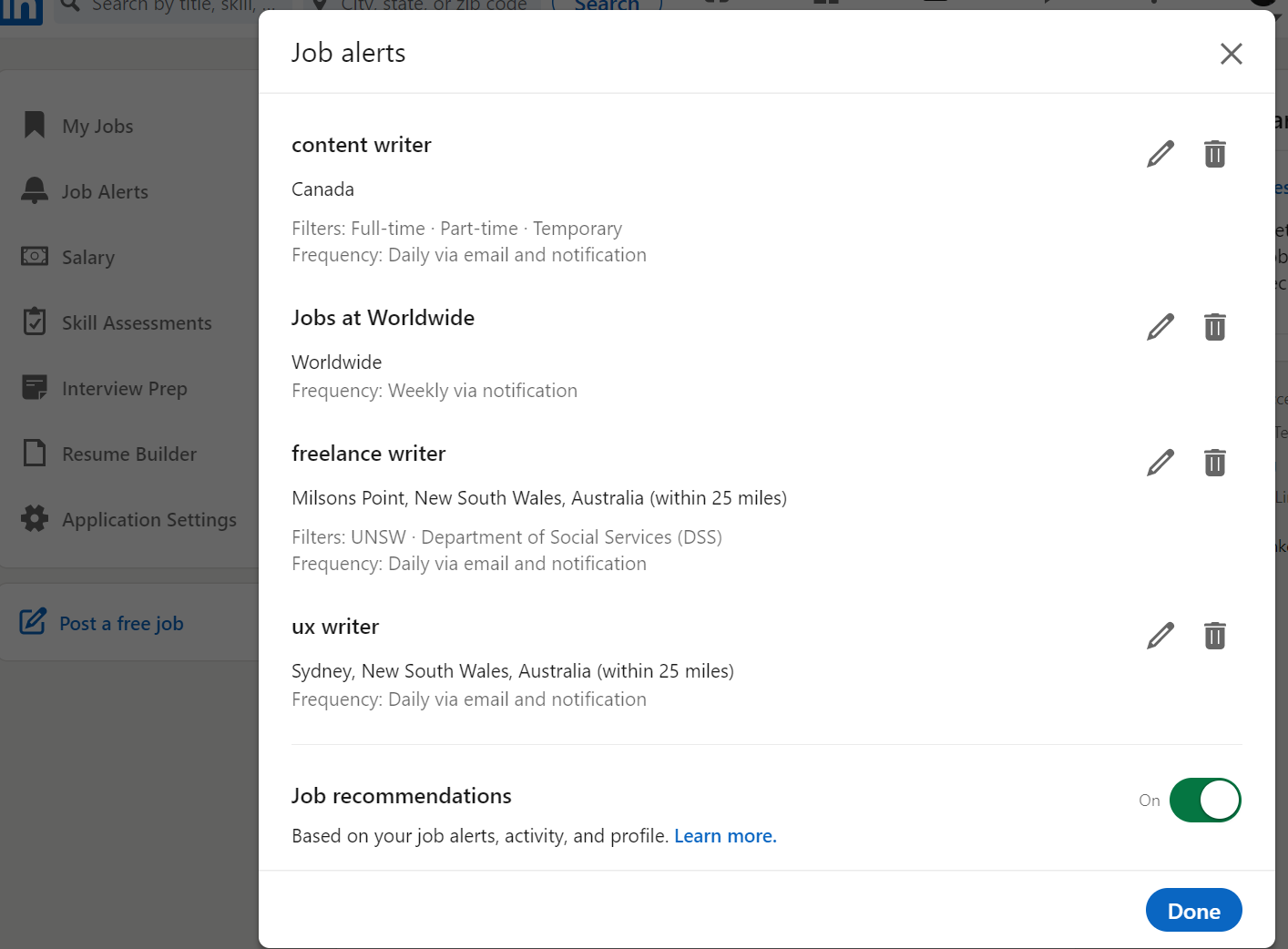 To keep abreast of the new openings in the market, it's helpful to set job alerts. You can create multiple alerts based on different regions or job types. You can also choose to get these alerts delivered via email, and view recommendations by enabling the Job recommendations option at the bottom of the window.