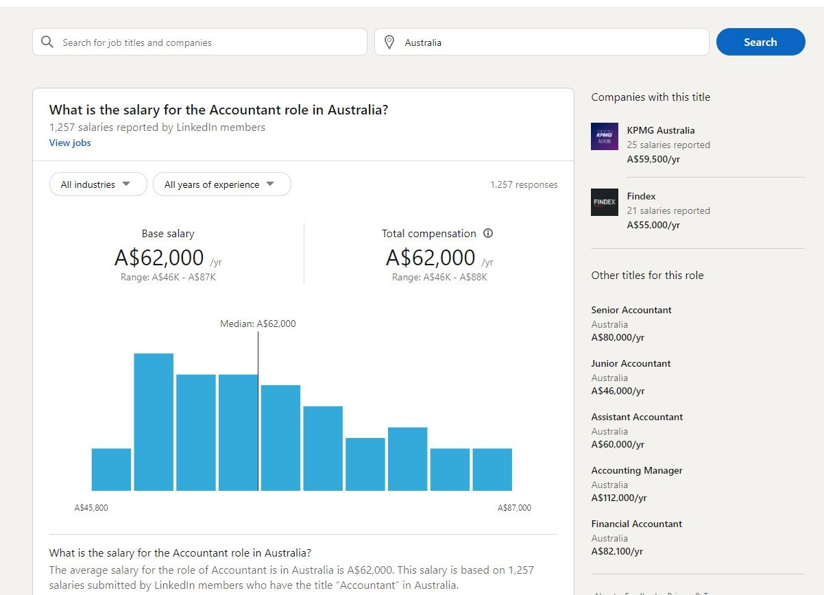 Navigate to the LinkedIn Salary website and enter the job title or company and location. Then, you'll find the median salary for the role and list of companies offering that role.