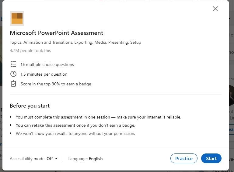 If you want to stand out from other job applicants, you can take the skill assessment test and share the results on your profile.