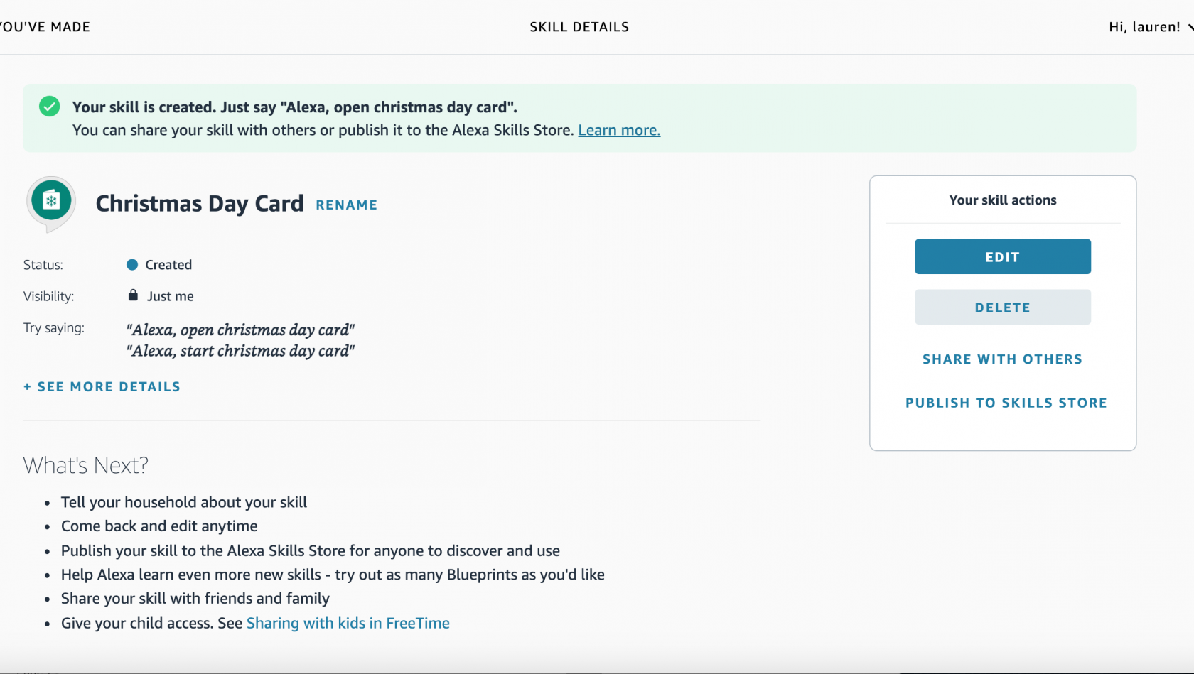 Next you have to name your skill, so when you send the command to Alexa, she knows what she is responding to. For example; “Alexa, send Christmas Day Card to Maggie and Christopher Newbold.”