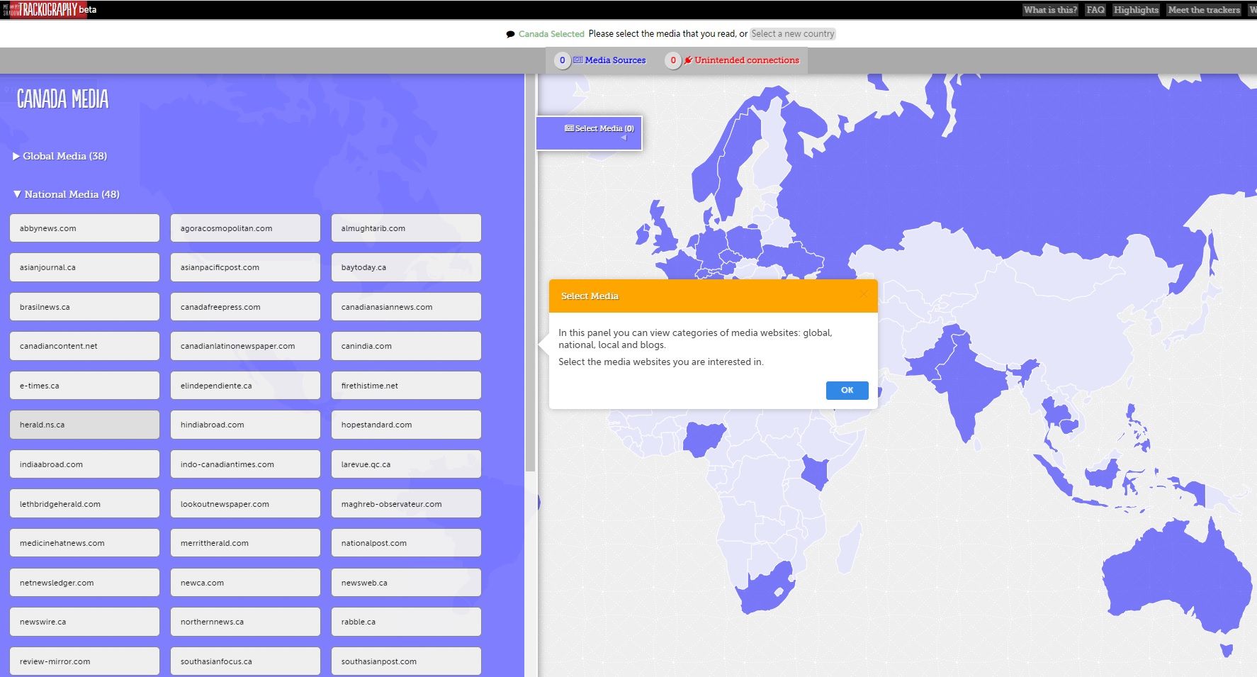 Head to the Trackography site. Select your host nation. Next, select a media website you want to connect to. Connection lines will immediately spread from your host nation, illustrating the path your data takes, as well as the multiple locations you had no idea your data was traveling through.