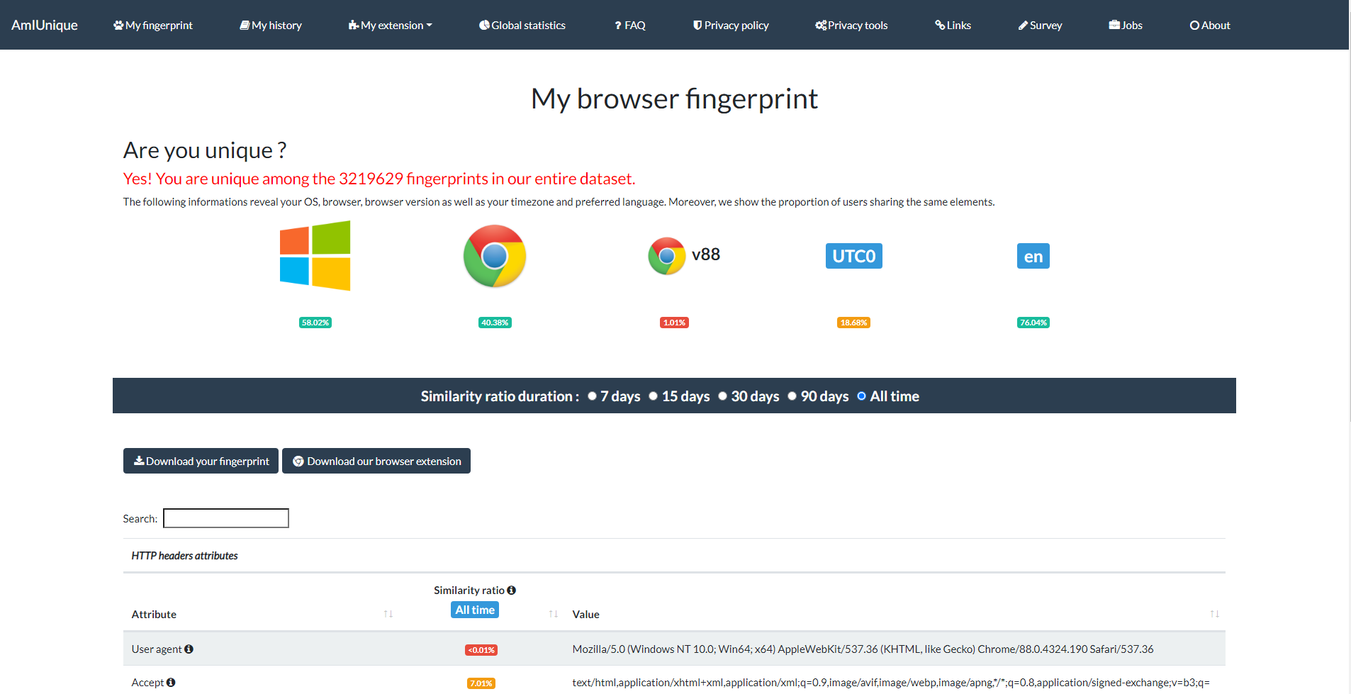 Am I Unique? takes a fingerprint of your system and adds it to its own database, adding a four-month cookie to your system in the process. You can then head back to the site in a few weeks and examine the changes to your browser fingerprint and if you have become more or less unique.