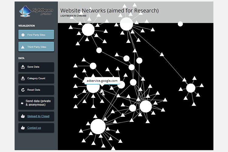 Lightbeam is a visual aid to online trackers, displaying the extremely tangled web of trackers between individual sites you visit.