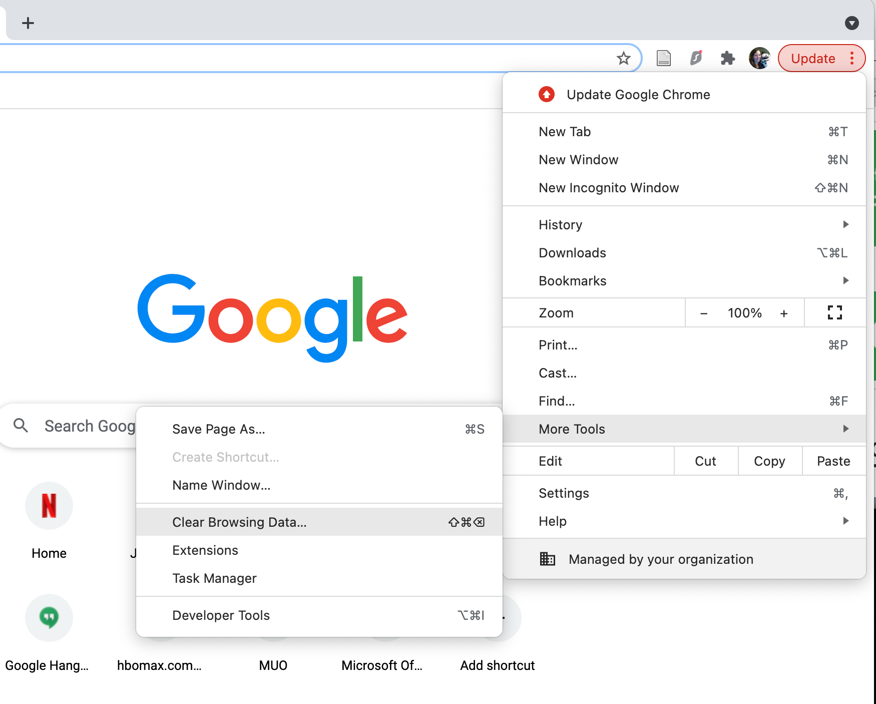 The fastest way, and the way we’d recommend, is to click on the three dot menu icon and select More Tools > Clear Browsing Data. You can also go to Chrome in the top menu and select Clear Browsing Data there, or use the shortcut Shift + Cmd + Delete.