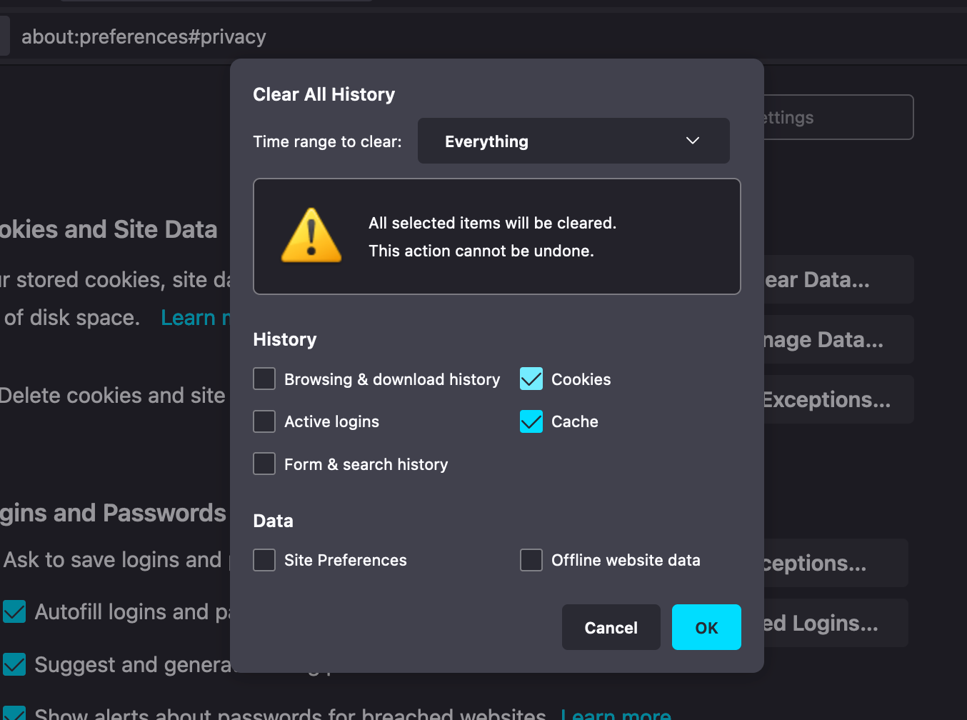 Firefox is another browser that conveniently lets you clear your caches and cookies in one place.