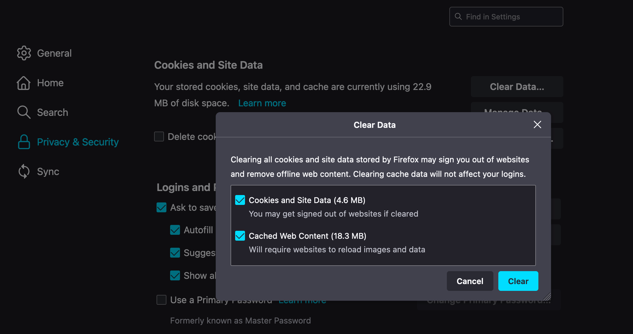 Scroll down to the Cookies and Site Data header and click on the Clear Data button you find there. A window will appear. Check the boxes beside Cookies and Site Data and Cached Web Content in the window. Then hit the Clear button.