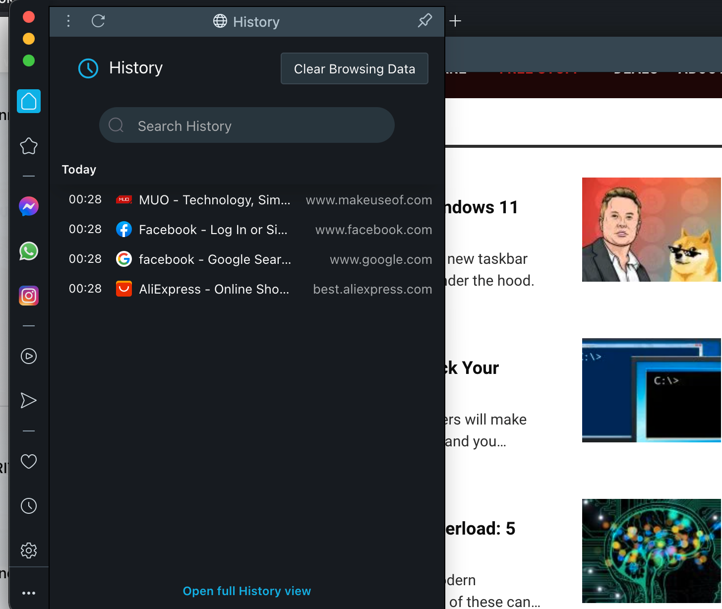 Open your Opera History by clicking the clock icon on the side menu, or by clicking History > Show All History from the top menu. You can also use the keyboard shortcut Shift + Cmd + H.