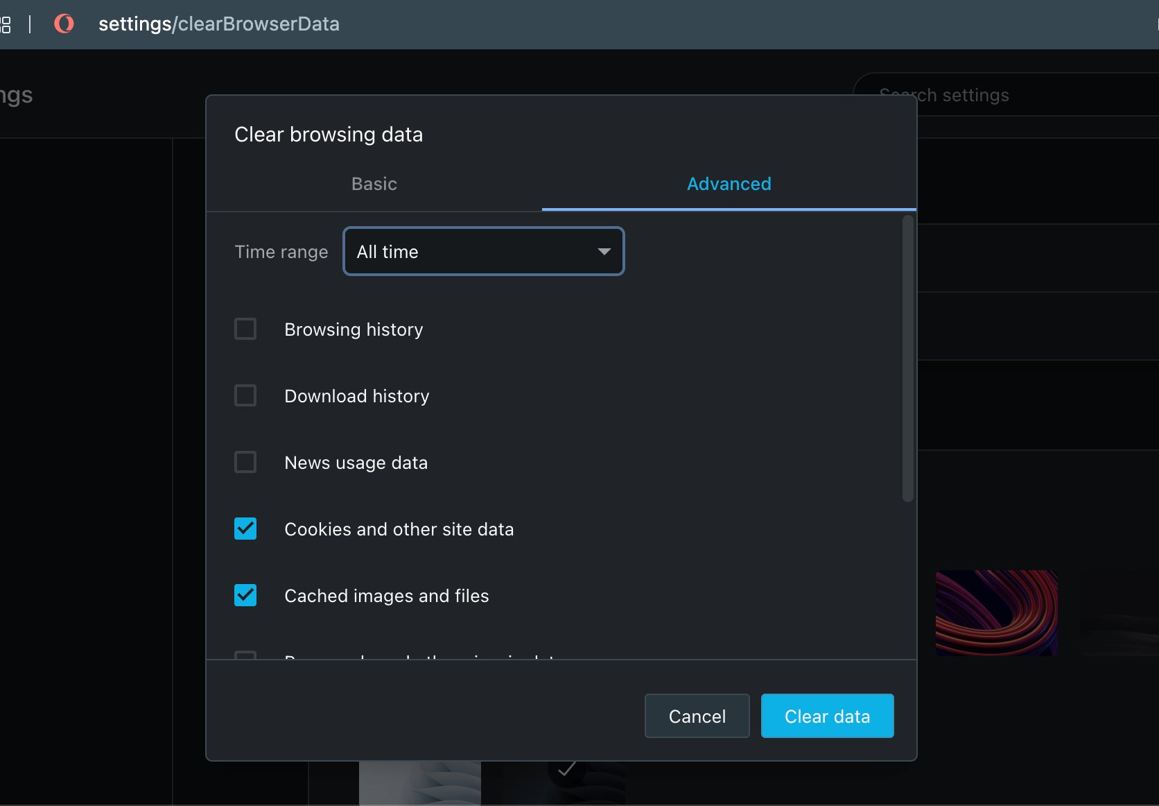 Click on the Clear Browsing Data button. You’ll be brought to Opera’s Settings in a new tab, where you’ll find the Clear browsing data window open.