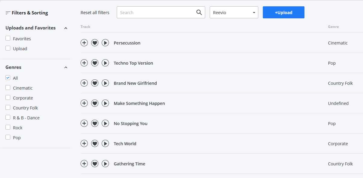 It’s easy to find and download free music from sites like YouTube and Jamendo. If you don’t have a file to upload, however, Reevio’s ready-made options can be just as effective. Expect to find a range of basic melodies with some impressive tracks mixed in.