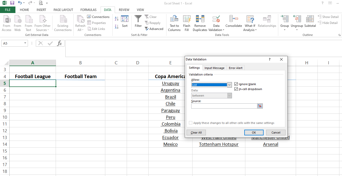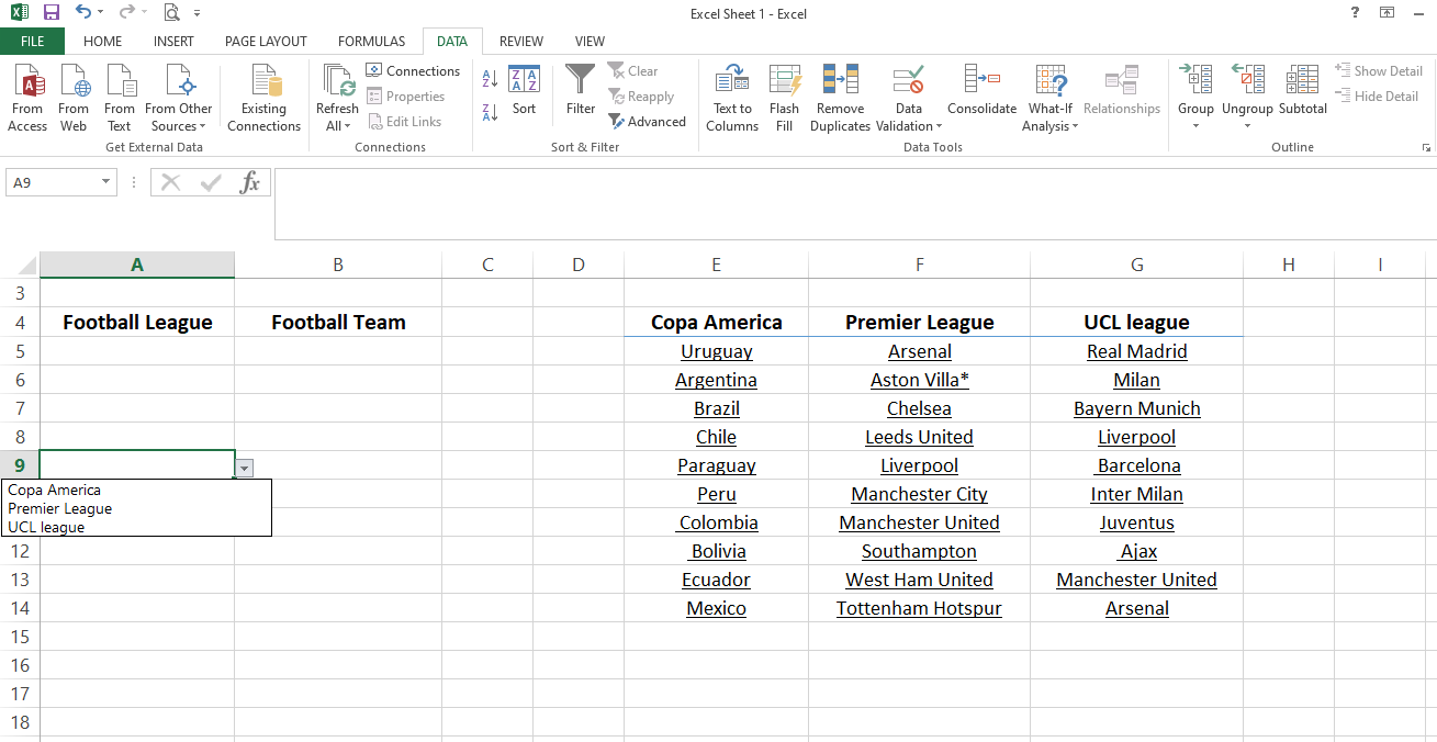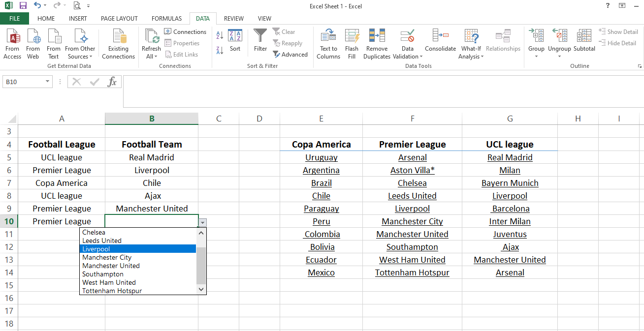 The football team’s drop-down menu relies on a simple drop-down list you have just created. If you choose a specific league, then you should have the chance to select a team from the Football league drop-down menu containing only teams from that league.