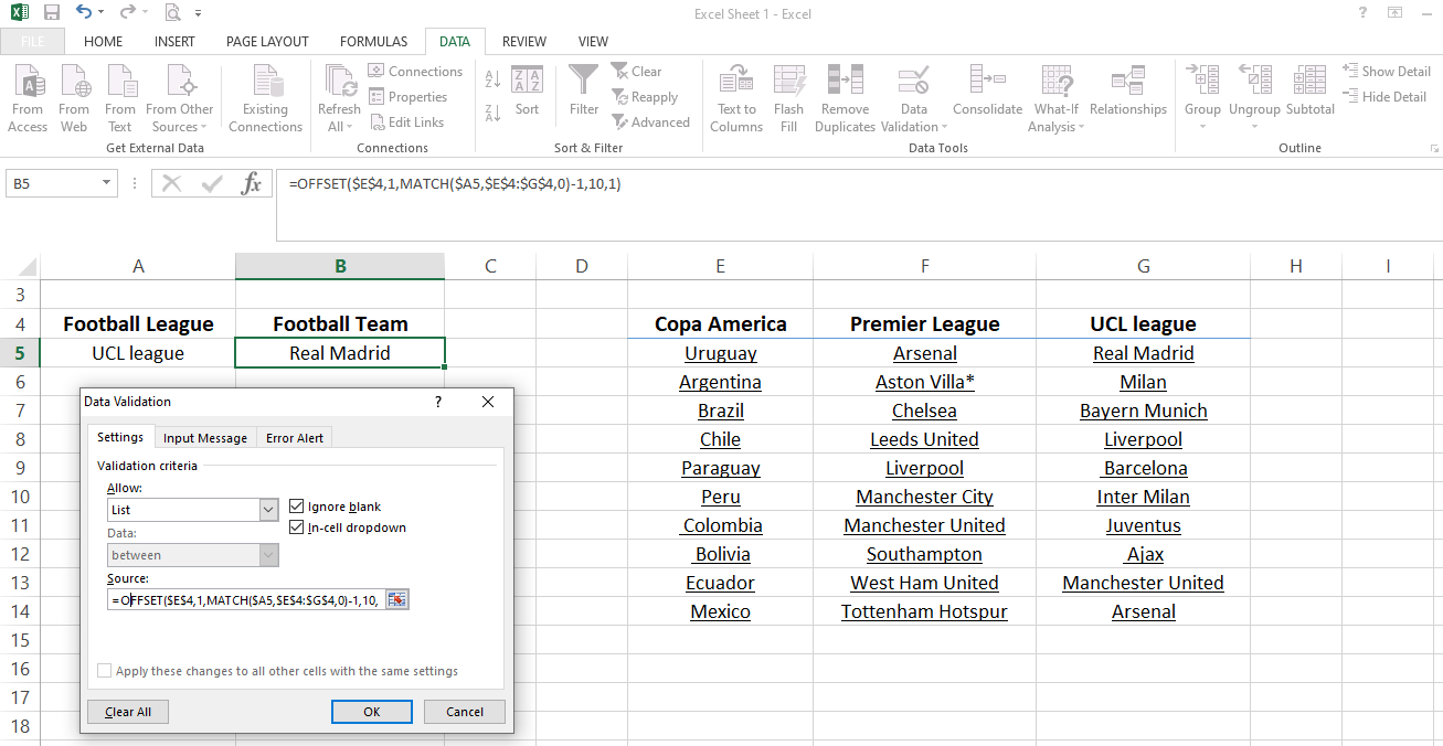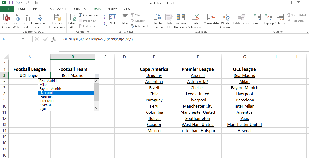 Once executed, the formula will generate multiple dependent drop-down menus for football teams.