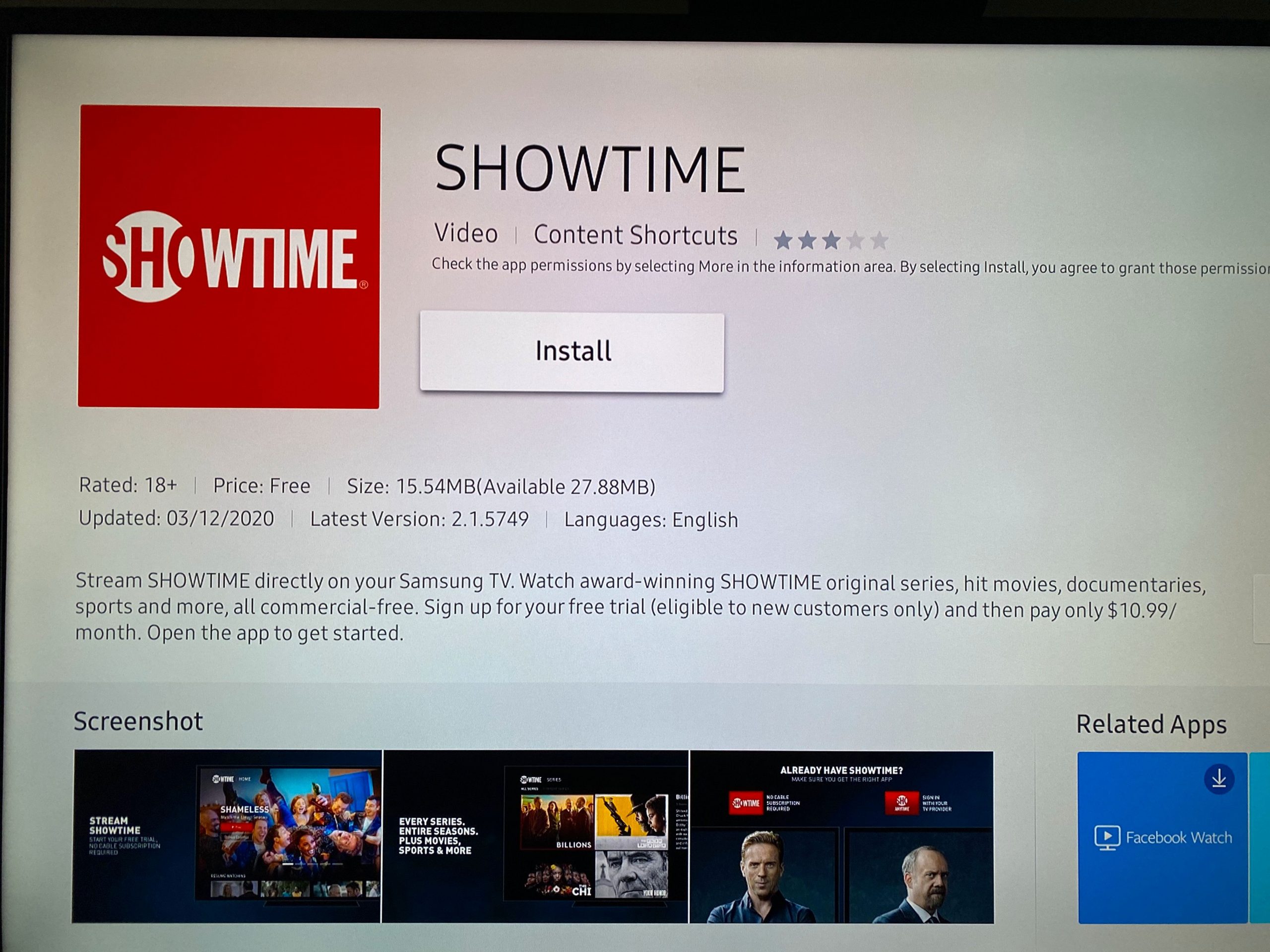 When you open an app’s page, you’ll see information about it, like its size, date of last update, screenshots, and a brief description. To install the app to your TV, simply hit the big Install button here.
