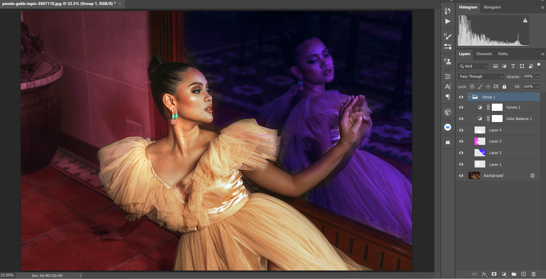 We also applied Curves and Color Balance layers as finishing touches, and then grouped all of our changes together into one folder to make it easy to toggle between before and after views.