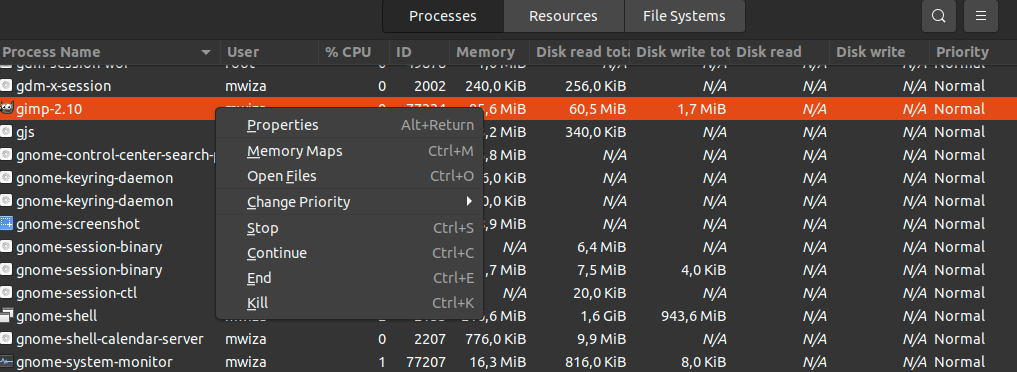 - End: To terminate a process, select the End option in the context menu. It sends a signal of 15, and the system terminates the process cleanly.