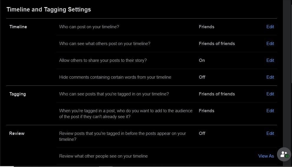 The settings that we’ve seen so far largely control how you can adjust settings for your own posts. But with Timeline and Tagging Settings, you can adjust the permissions for posts shared by others on your timeline. This includes who can post on your timeline and who can see what others have posted on your timeline.
