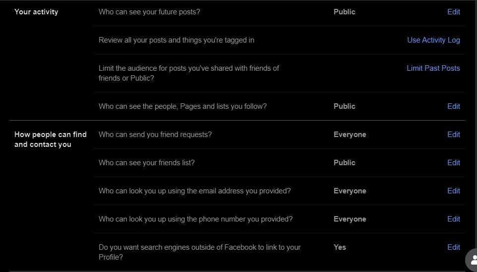 This dashboard is where you’ll find more specific privacy controls. In the Your activity section, you can limit the audience of past posts. You can access this setting by clicking on Limit Past Posts.