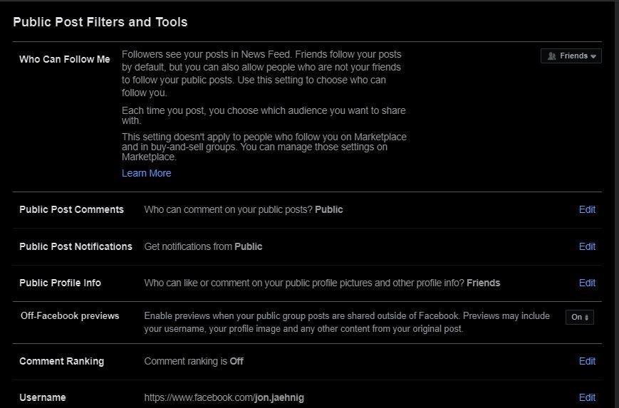 By selecting Public posts, you can access Public Post Filters and Tools. In addition to controlling who can follow you at all, you can control who can comment on your posts and how people can interact with your public information.