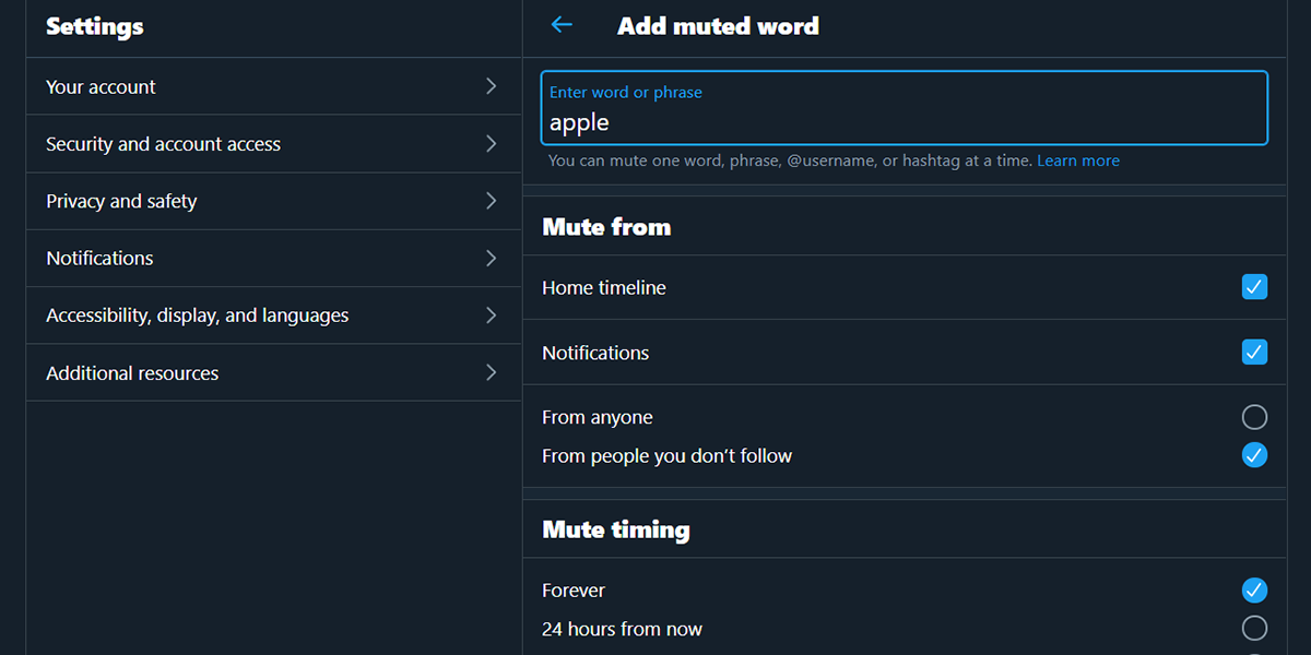 - Select whether to mute this word on your timeline, your notifications, or both.