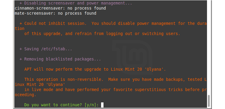 Make sure any power managers are turned off (screensaver, suspend, etc.) to guarantee the upgrade goes smoothly. Keep an eye on the terminal output too, as you may be prompted with questions and alerts.