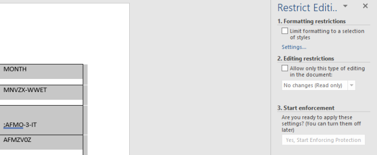 In the Restrict Editing pane, set your preferences and click on Yes, Start Enforcing Protection.