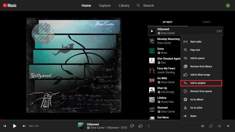 From anywhere in YouTube Music, tap on the cover art for the song you’re listening to or tap the three-dot menu. Next, select Add to playlist.