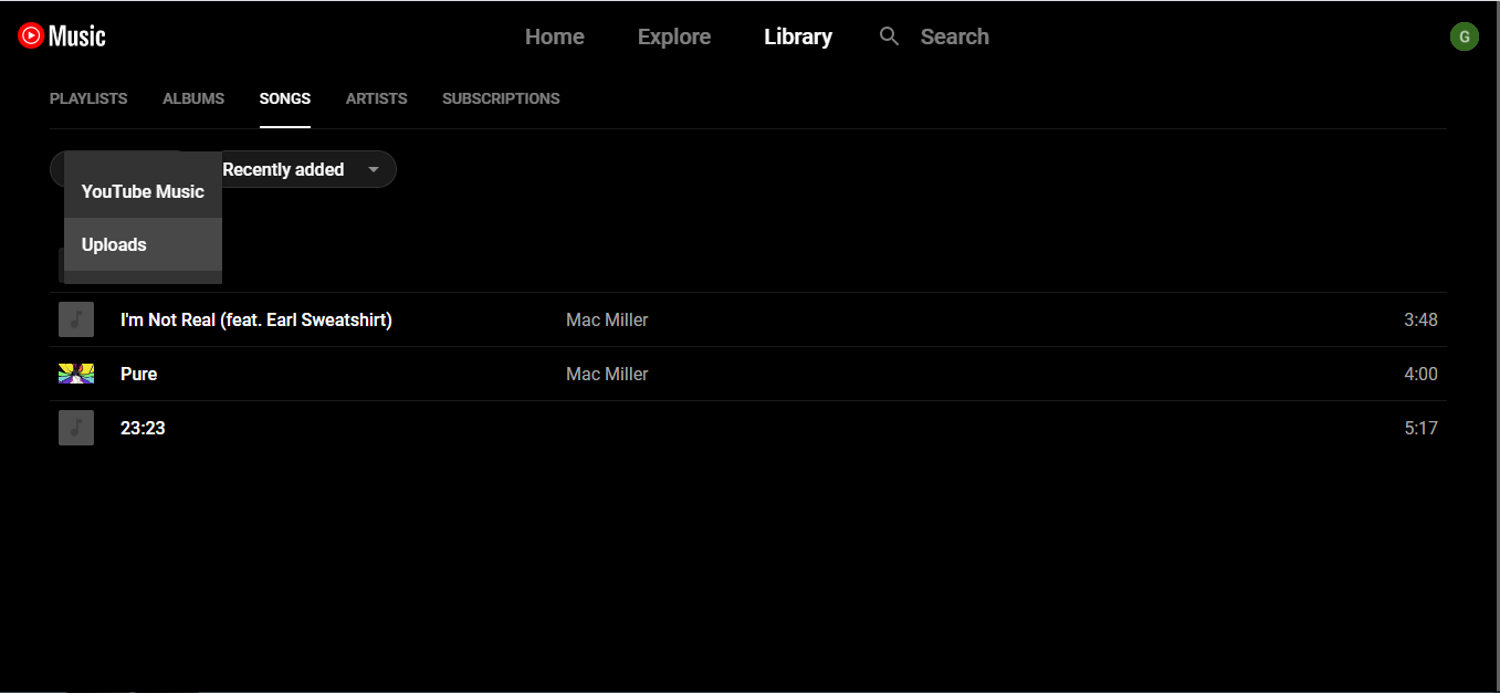 You’ll see the Songs section by default. Beneath there is a drop-down menu with two options: YouTube Music and Uploads. You’ll want to choose the latter.