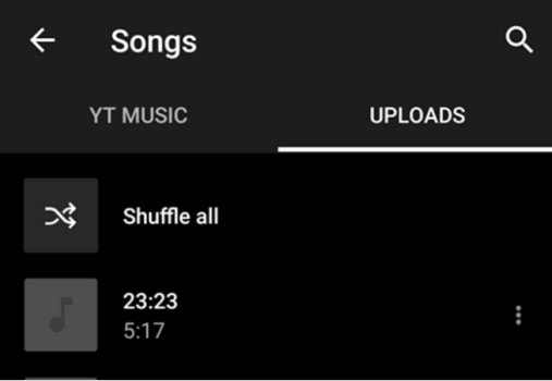 Next, choose the Songs option to view all of your music from different artists. Just like on your computer, you’ll have a YouTube Music option and an Uploads option. Select the latter.
