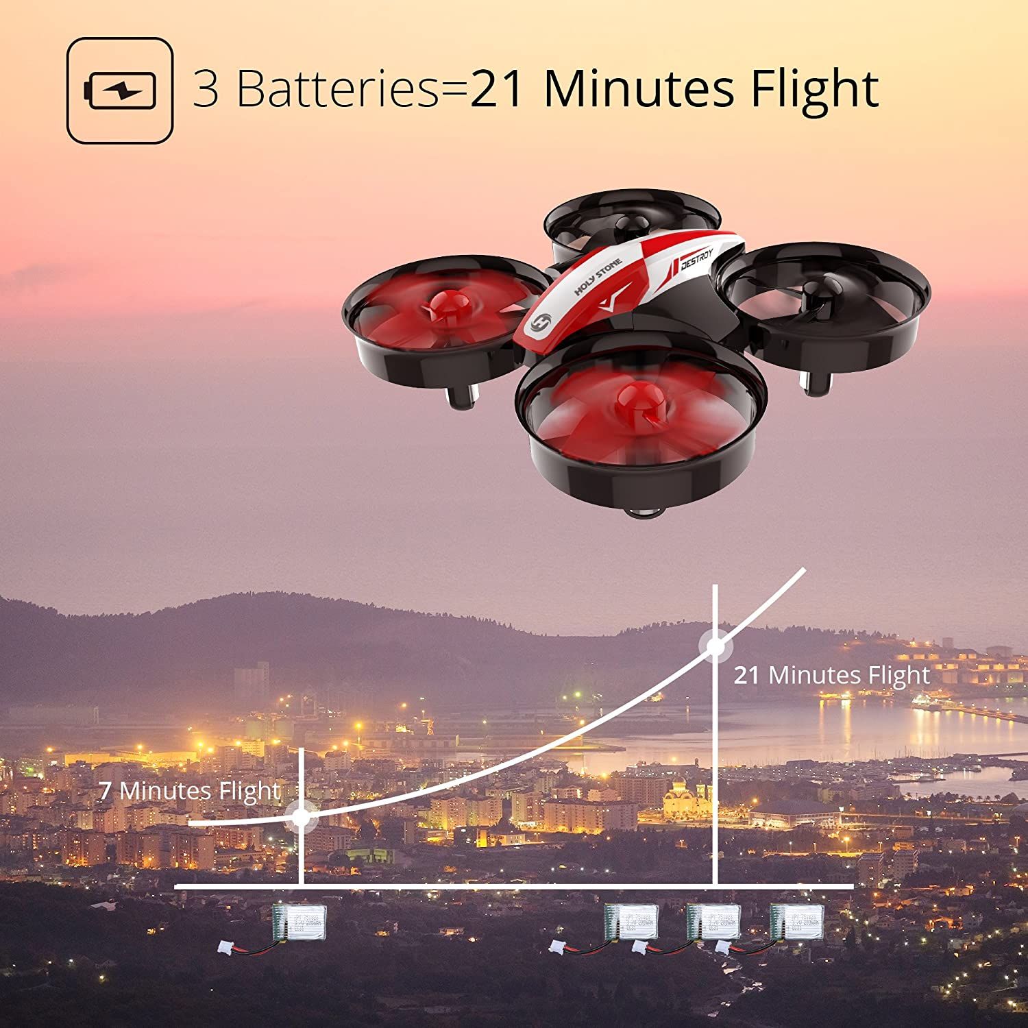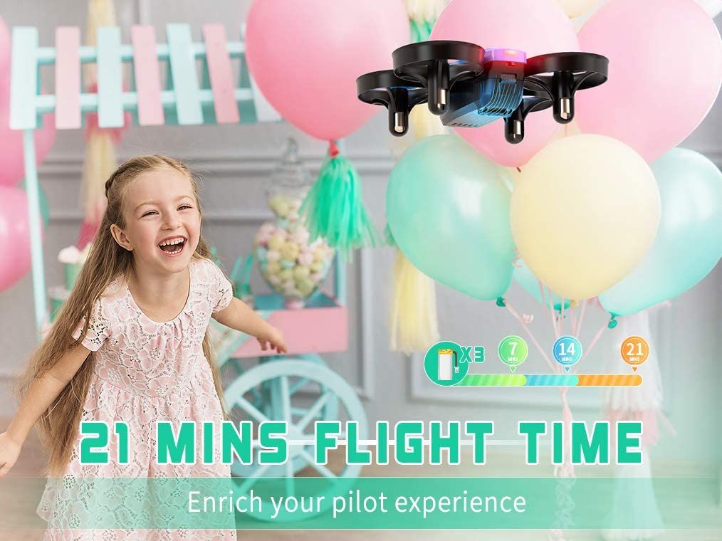 - Comes with three batteries for a combined 21 minutes of fly time