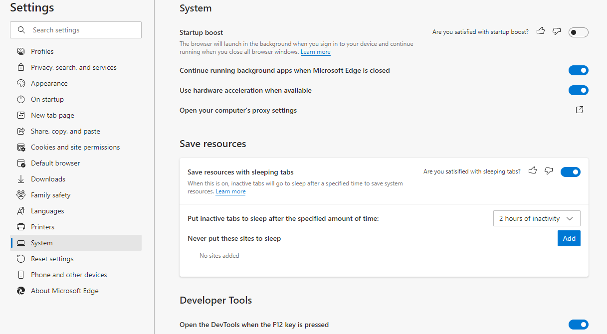 To put tabs to sleep, click on the ellipsis icon at the top-right of your browser and go to Settings > System. Under the head Save resources, make sure the slider next to Save resources with sleeping tabs is turned on. Below you’ll see an option to choose the duration of inactivity after which you’d like Edge to put tabs to sleep.