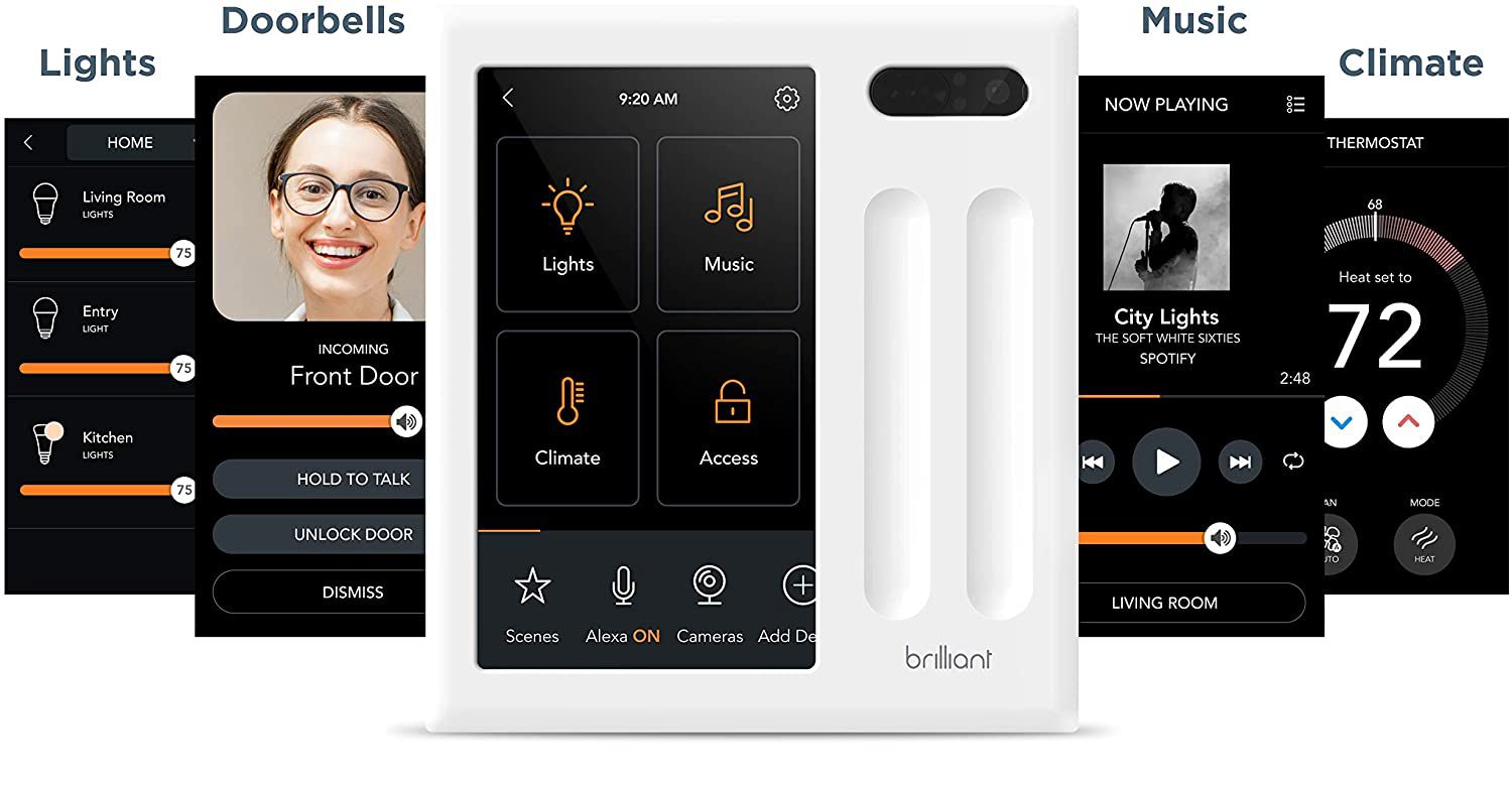 The Brilliant Smart Home Control brings a Wi-Fi switch and much more. The signature feature is a 5-inch LCD screen with a built-in camera. Using the LCD screen, you can control several different smart home devices like a thermostat, locks, and more. You can also view compatible cameras and doorbells.