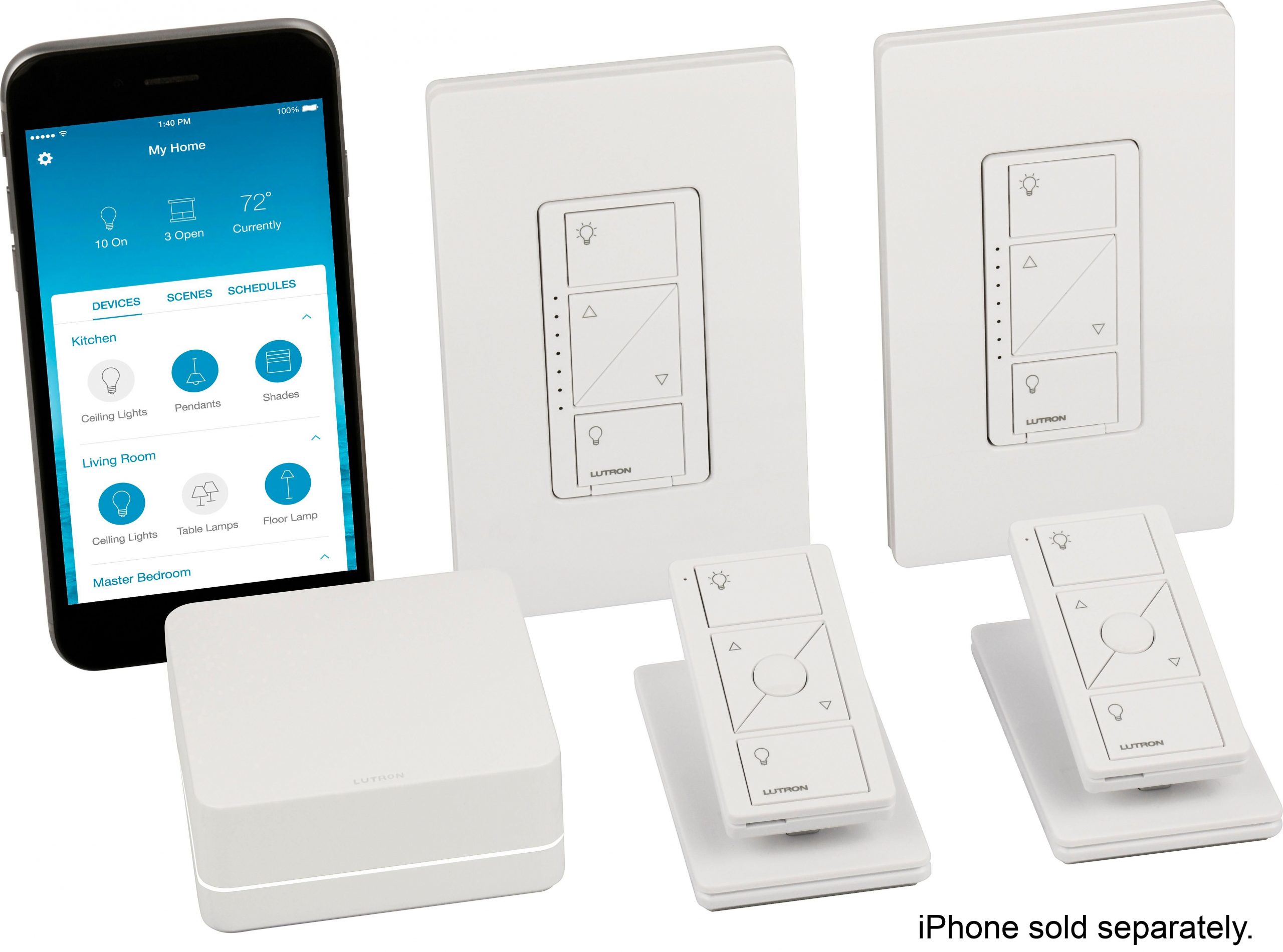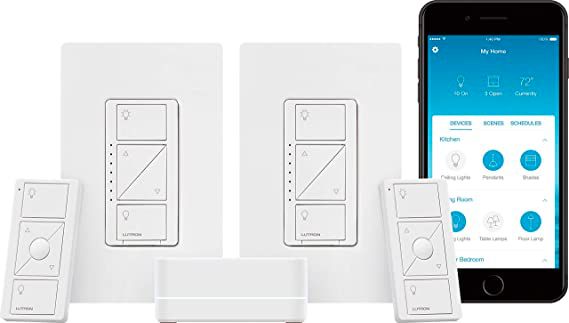 Dimmer switches are also another unique type of lighting many homeowners take advantage of to provide a different light in a specific location. The Lutron Caseta Wireless Smart Light Dimming Switch Starter Kit offers a hub, two switches, and two remote controls.