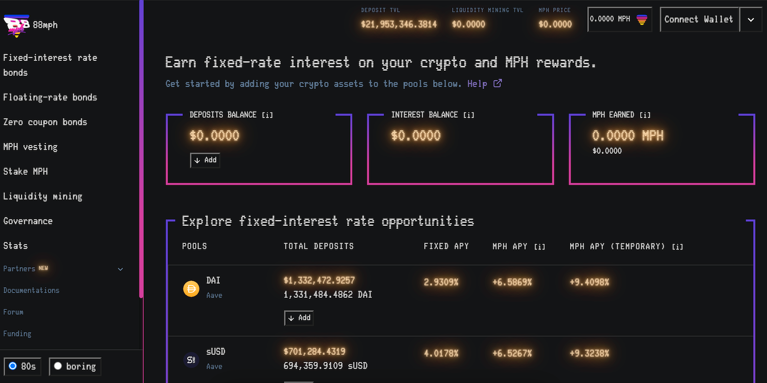 88mph is a DeFi platform that allows users to deposit cryptocurrency assets and earn interest at a fixed rate. 88mph differentiates itself from other DeFi platforms by offering users the option to purchase floating-rate bonds.