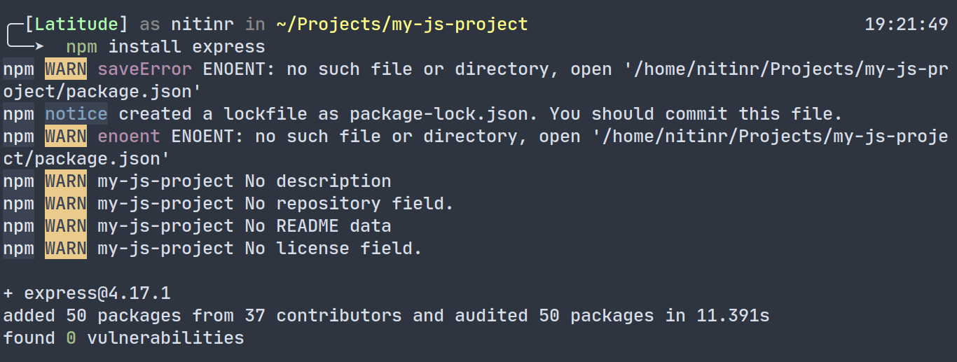 To use the installed packages, you’ll have to require or import them into your JavaScript code. The syntax for doing so can be either of these two commands depending on the version of JavaScript you’re using:
