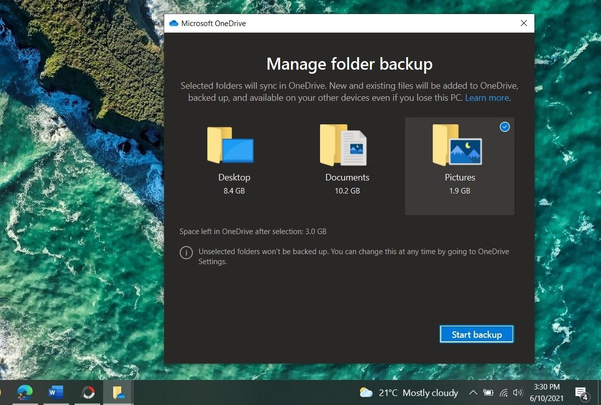 Pay attention to the Space left in OneDrive after selection, so you don’t exhaust your cloud storage. OneDrive will automatically backup your selected folder(s) with this setting as long as you’re hooked to the internet.