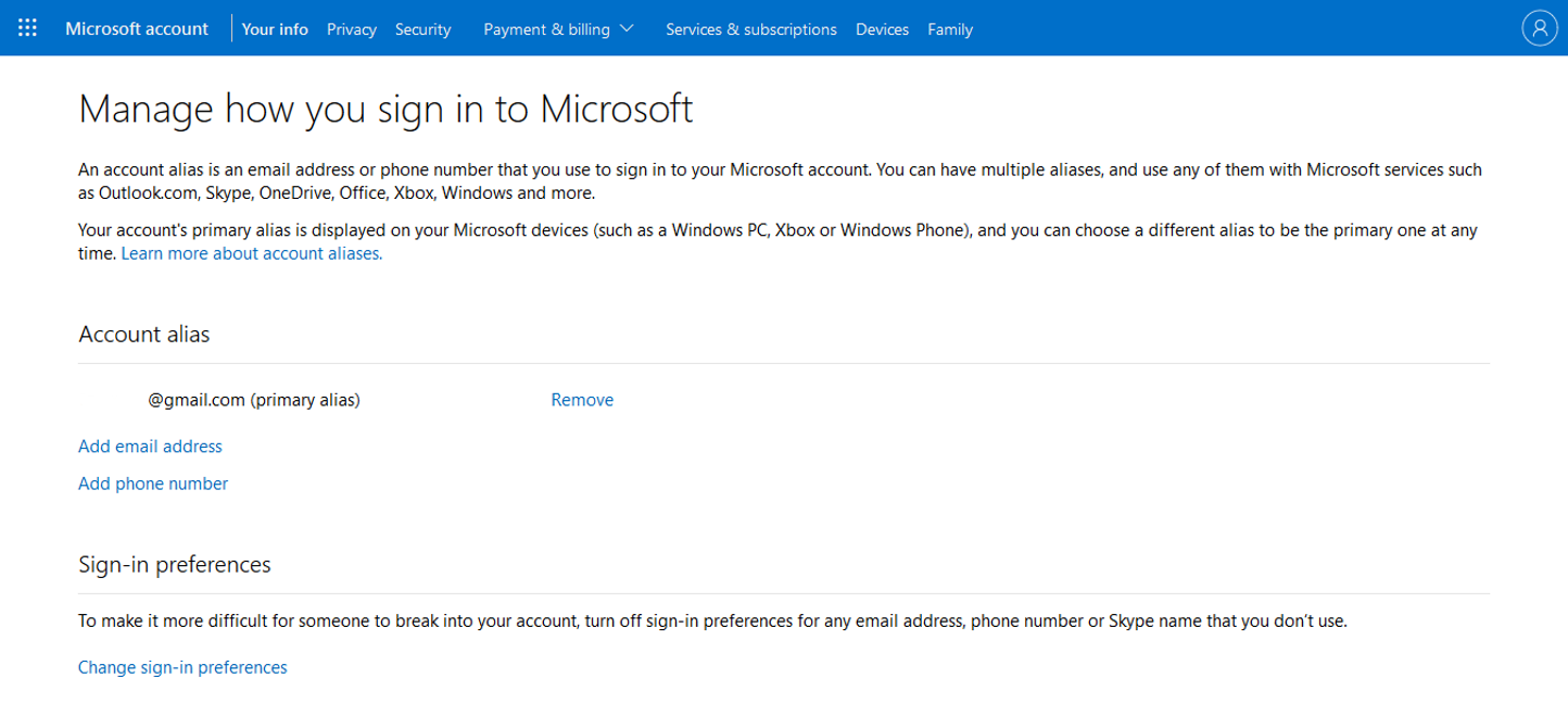 Once inside the Manage how you sign in to Microsoft page, it will present you with the options: Add email, Add phone number, and Remove under the Account alias header. Choose the option you need.